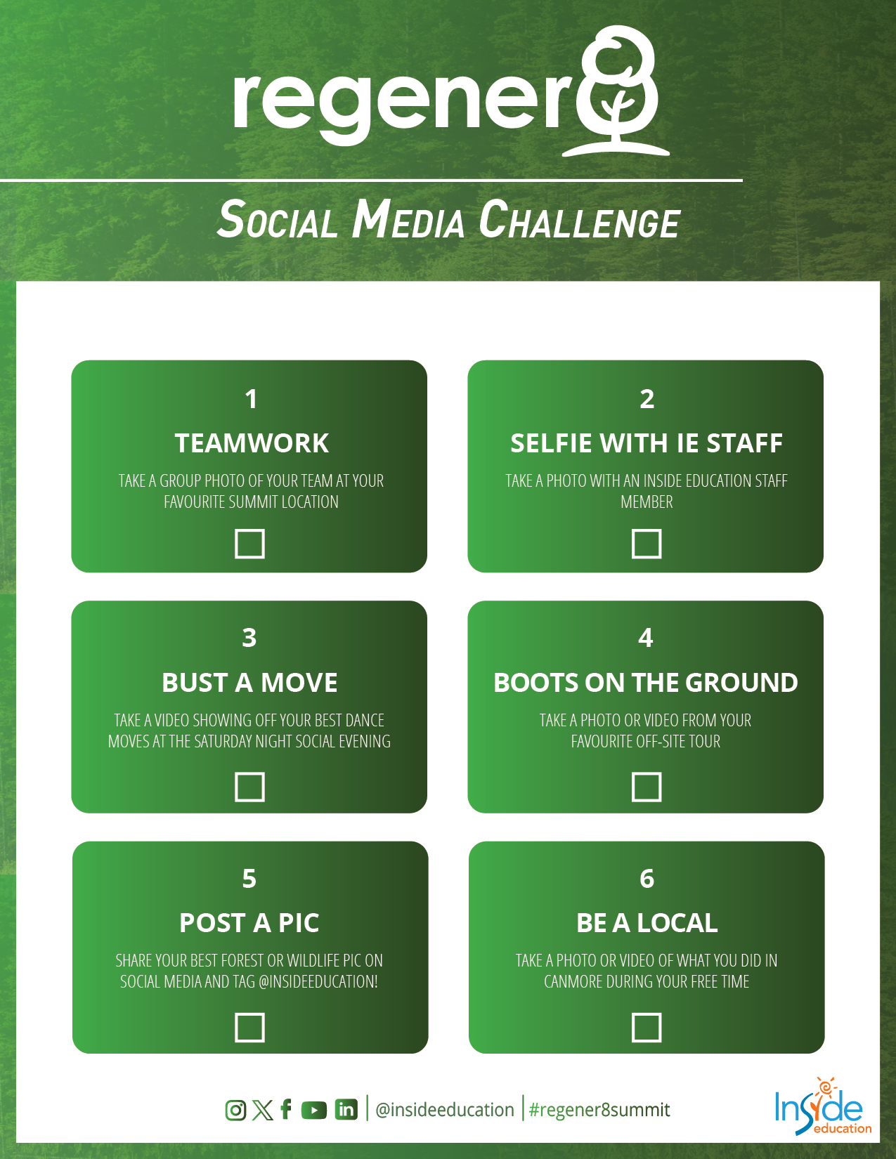 To compete the challenge, please post your submissions to either Instagram or Facebook, tag @insideeducation, and use the hashtag #Regener8Summit.